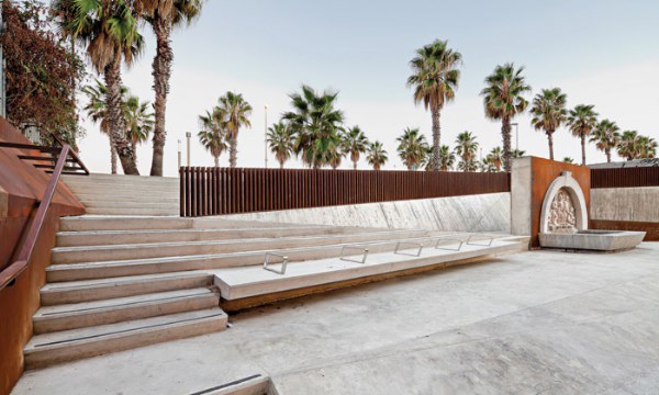 整個工程只采用了兩種建材,斜坡、臺階和墻壁使用了混凝土,欄桿和覆蓋層則使用了柯爾頓鋼。廣場圍墻使用的是混凝土加木材。光線從兩點照射過來,強(qiáng)調(diào)了噴泉的價值和全新的空間。